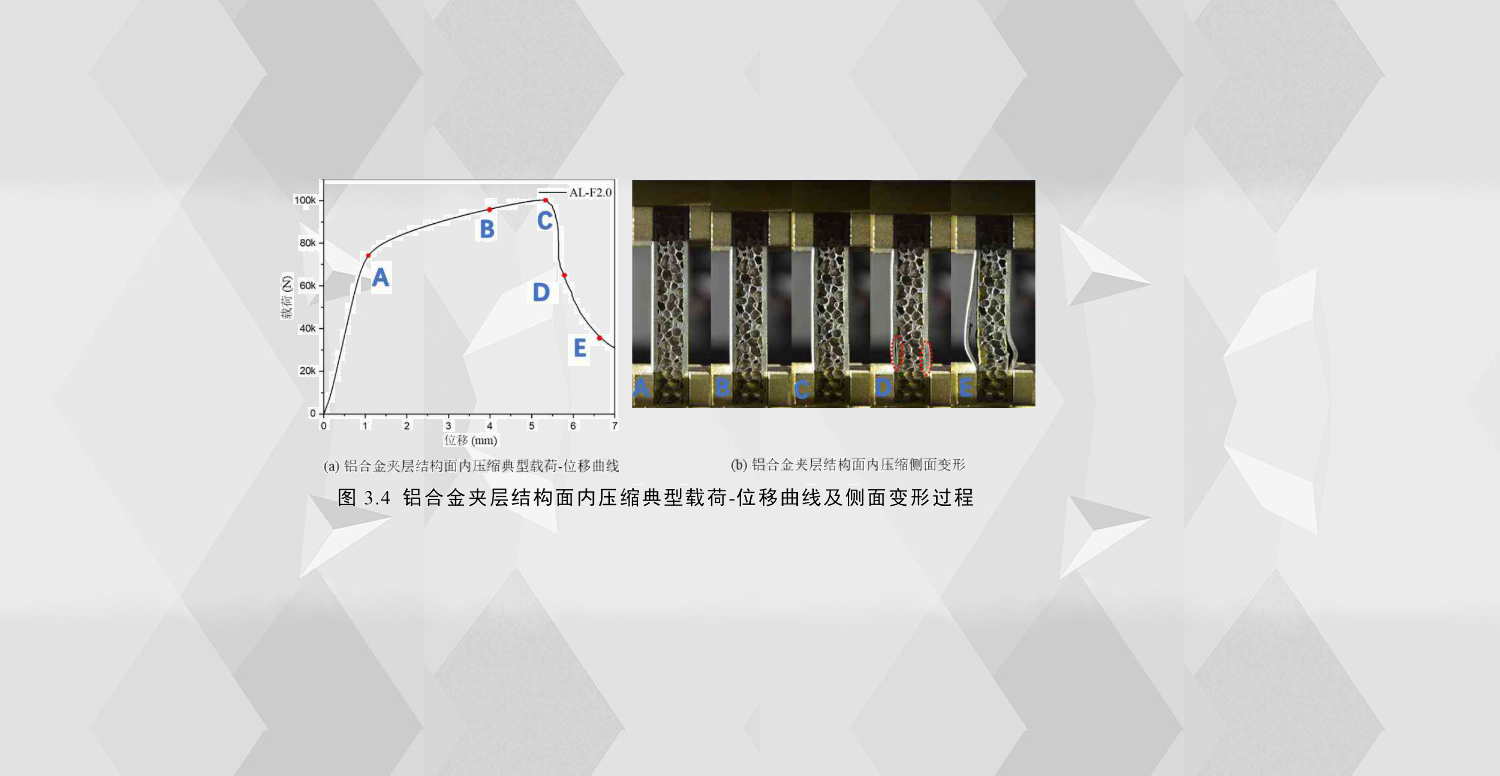 圖3.4(a)描繪了鋁合金夾層結(jié)構(gòu)在面內(nèi)壓縮下典型載荷-位移曲線,其壓潰過程大體可以分為三個(gè)階段,O-A彈性階段,此階段結(jié)構(gòu)處于彈性變形,載荷與位移的關(guān)系為線性增長(zhǎng);A-C塑性階段,在此階段結(jié)構(gòu)面板受到較大的壓力而產(chǎn)生塑性變形,載荷與位移仍近似呈線性增長(zhǎng)趨勢(shì),只是載荷增長(zhǎng)幅度遠(yuǎn)小于彈性階段增長(zhǎng)幅度;C之后屬于后屈曲階段,由于在此階段面板發(fā)生嚴(yán)重屈曲變形,并且面板與芯層之間的膠層出現(xiàn)大面積失效,這導(dǎo)致夾層結(jié)構(gòu)的承載能力大大降低,此外,由于泡沫芯層壓縮的效果,在面板失穩(wěn)之后夾層結(jié)構(gòu)仍有較弱的承載能力,并未完全失去承載能力,圖3.4(b)為此試件在圖3.4(a)各點(diǎn)時(shí)刻側(cè)面面板與芯層泡沫的變形圖。